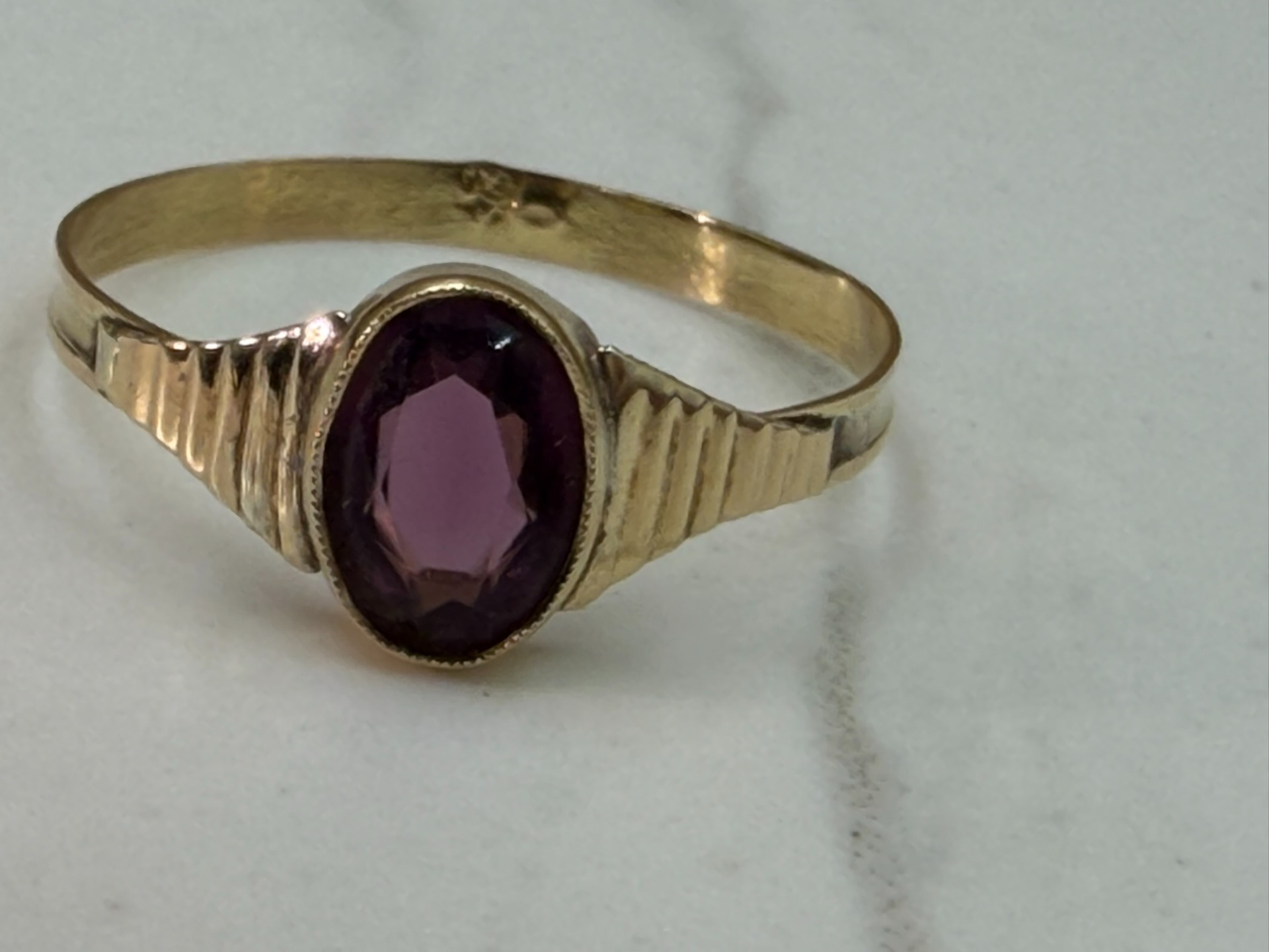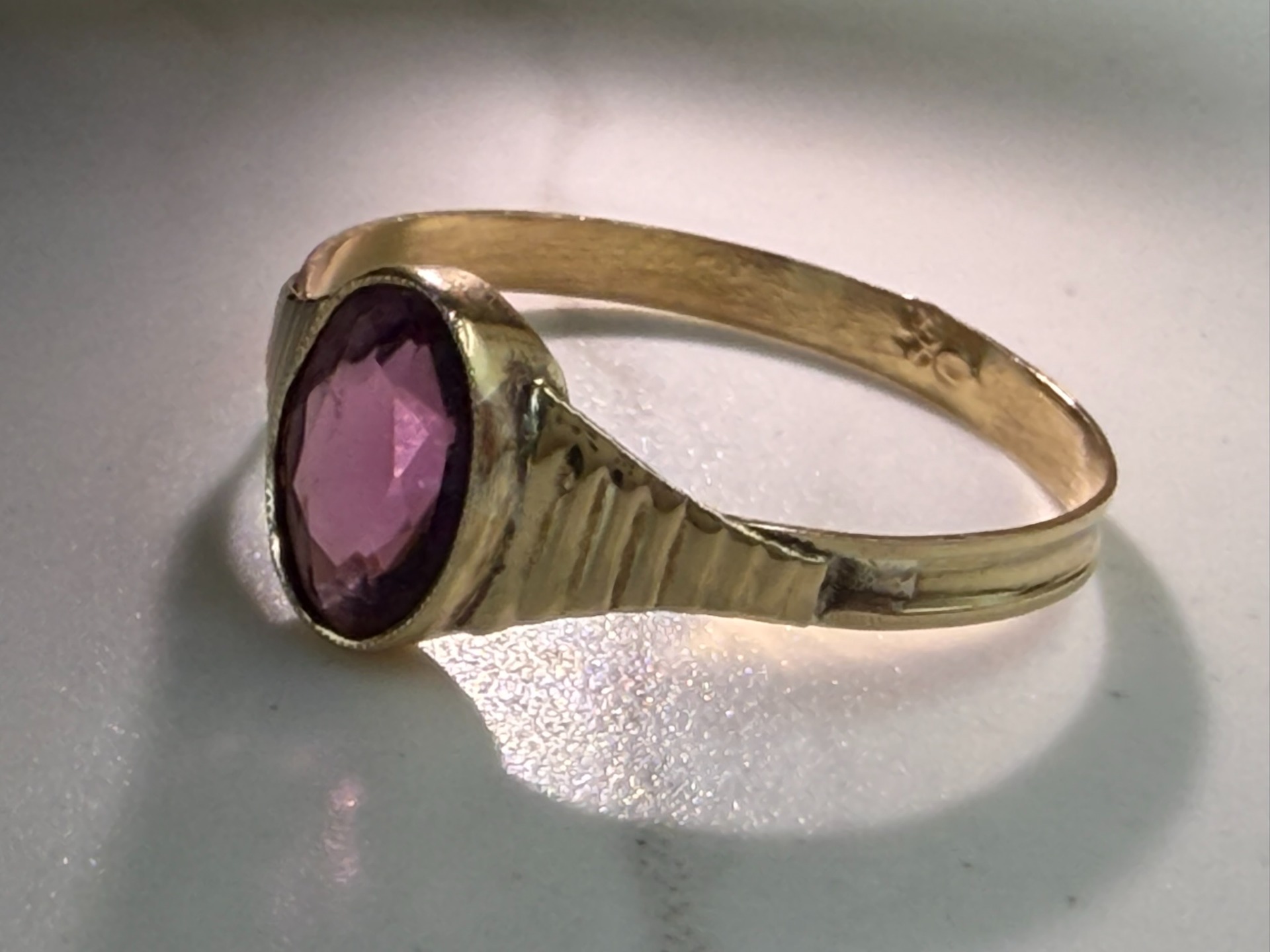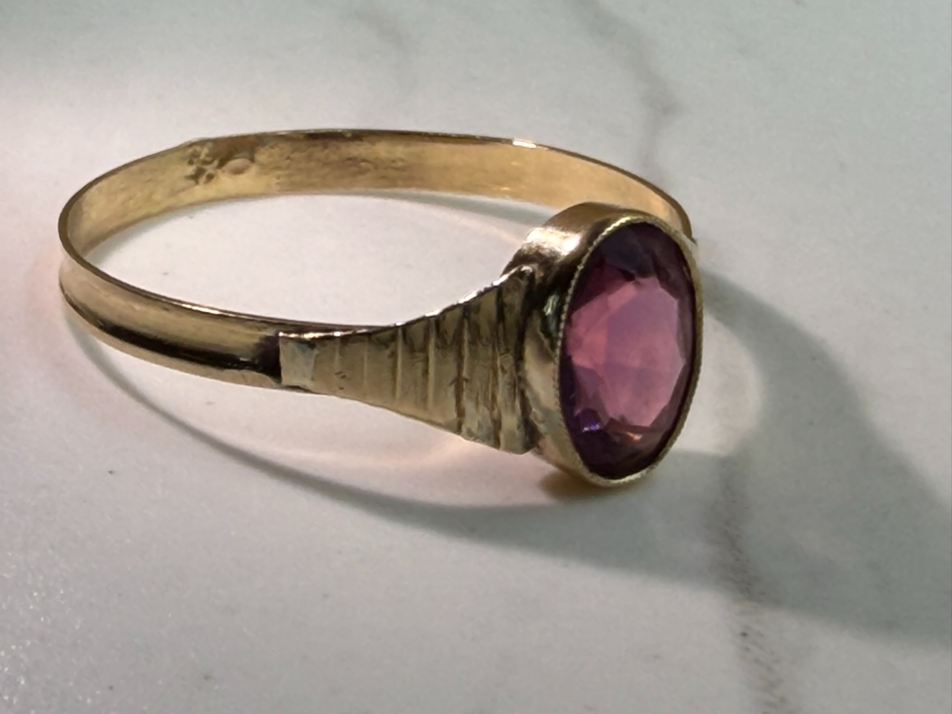 Prachtige vintage 14 kr gouden ring met amathist, de ring is speels door de zetting en de kleur van de edelsteen.