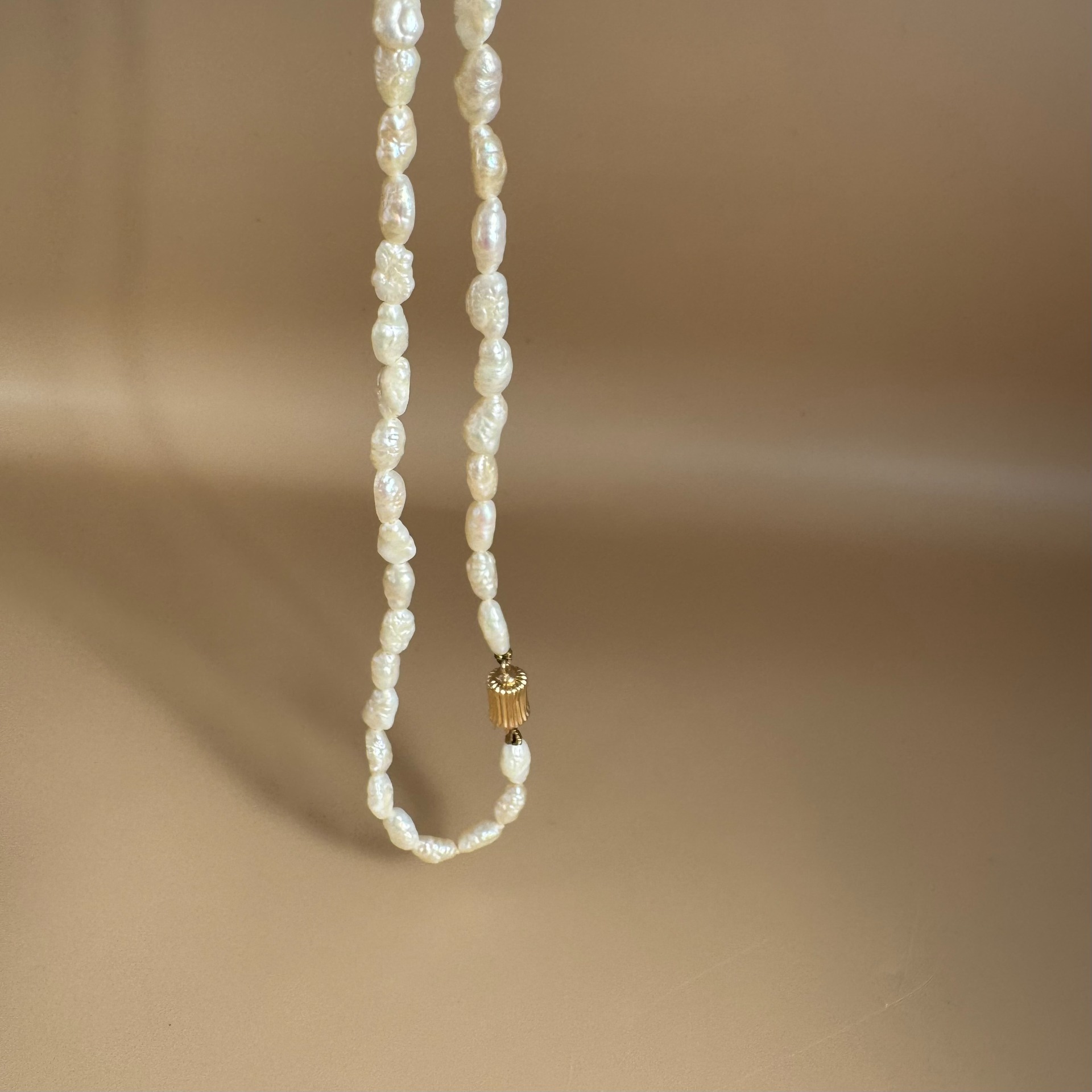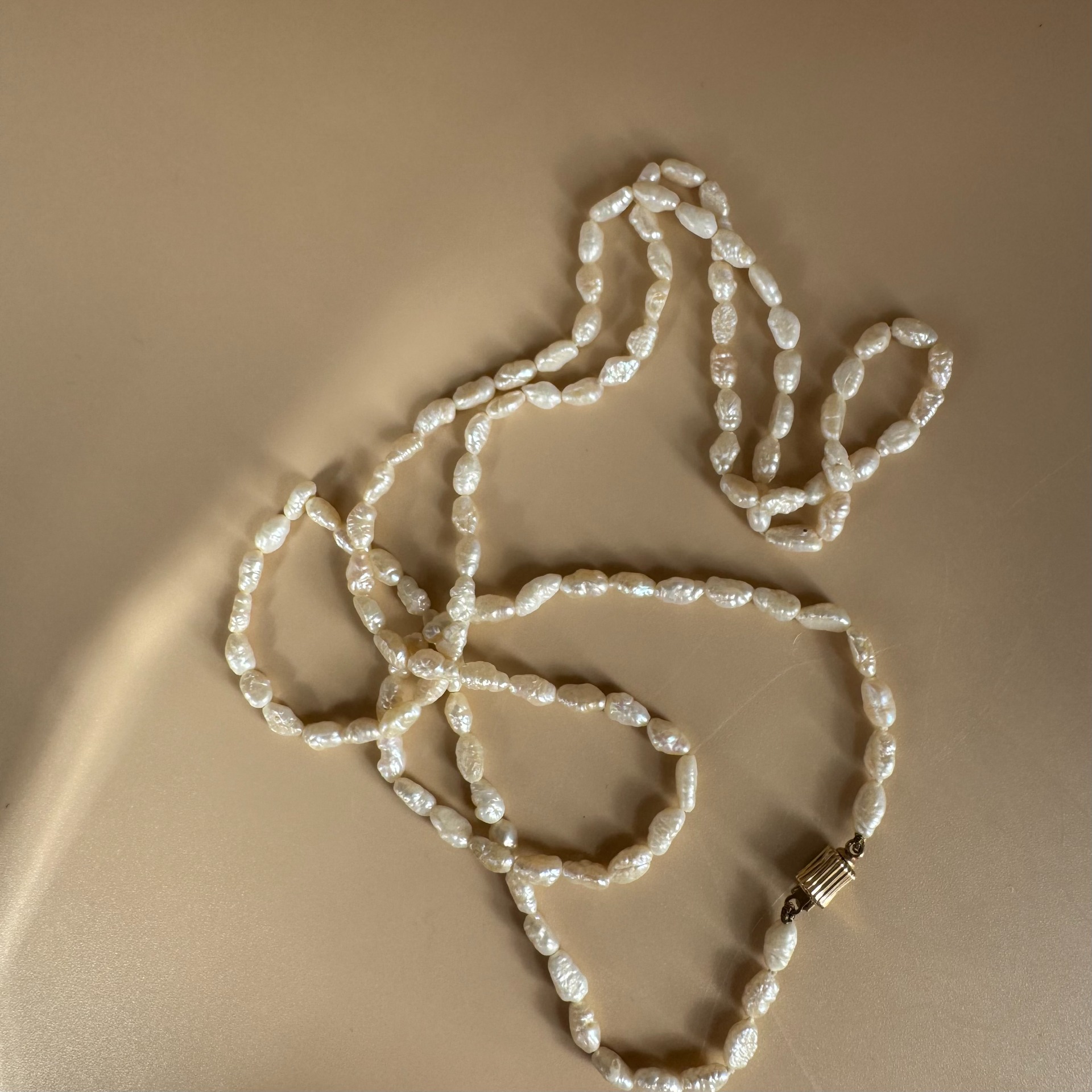 Prachtige lange parel ketting met 14 karaat gouden slot.