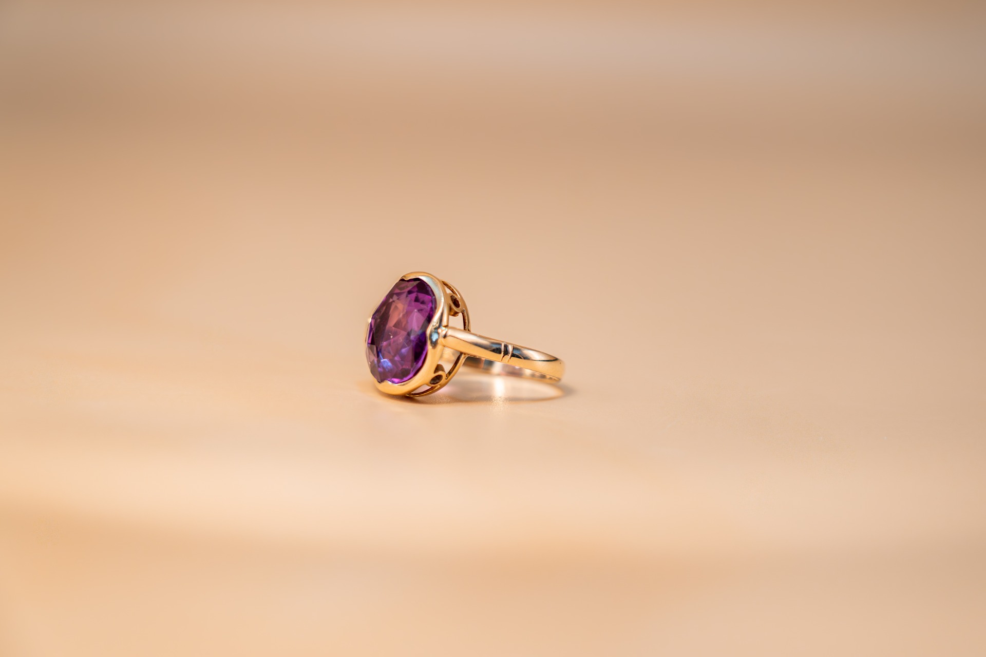 Deze prachtige 14 karaat gouden ring is elegant door zijn ronde vormen en de prachtige amethist. De zetting is iets hoger, maar nog wel fijn draagbaar.