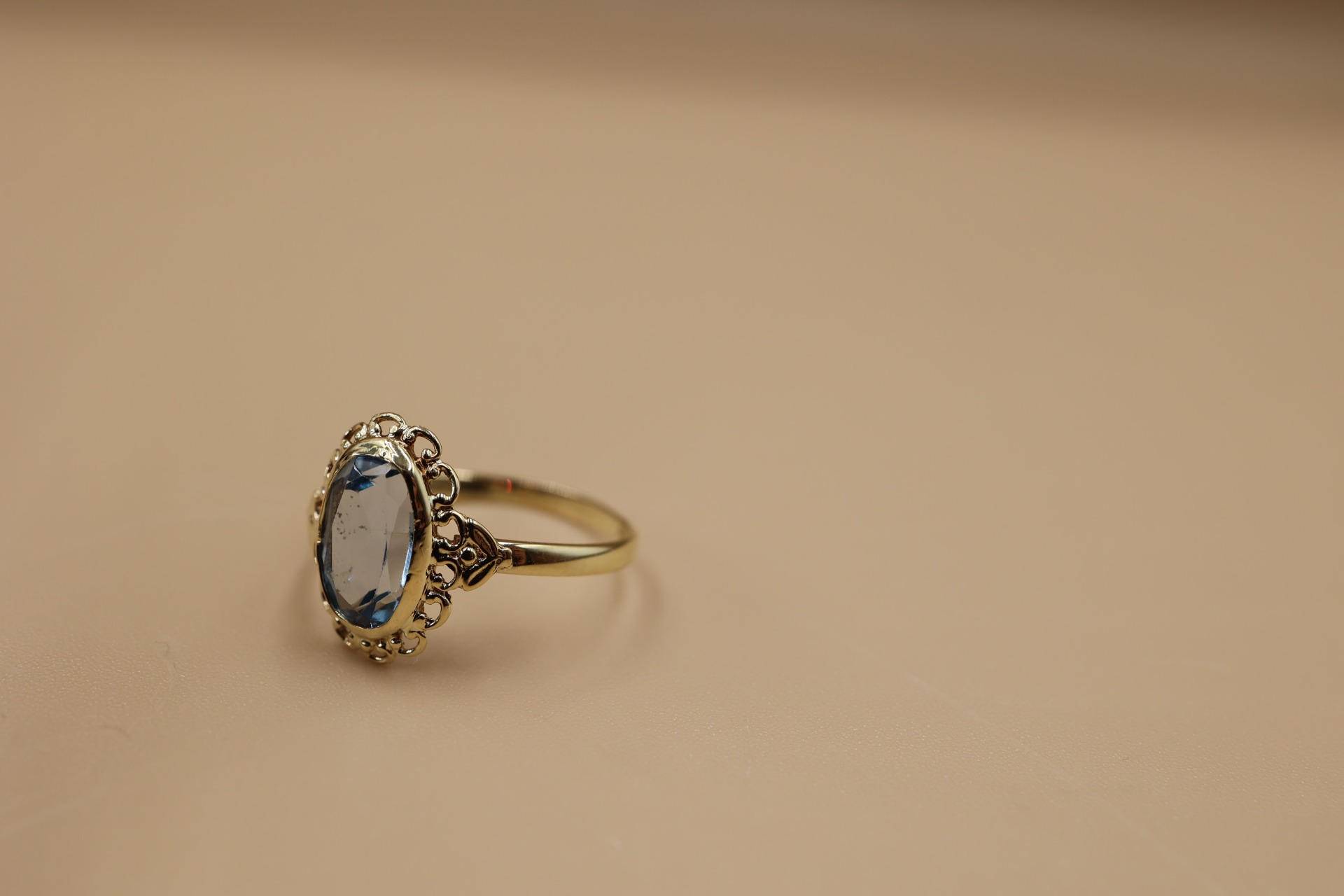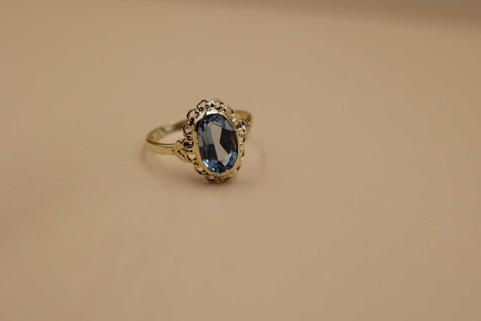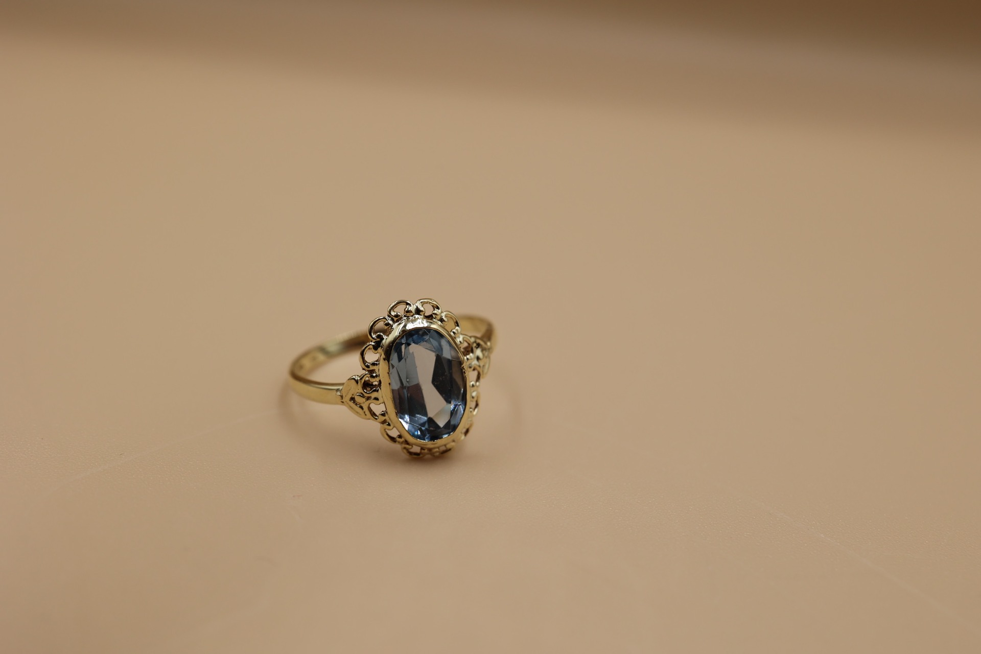 Prachtige vintage gouden ring met topaas. De ring is sierlijk door de zetting om de edelsteen. De edelsteen is zowel aan de bovenkant als aan de onderkant in facet geslepen.