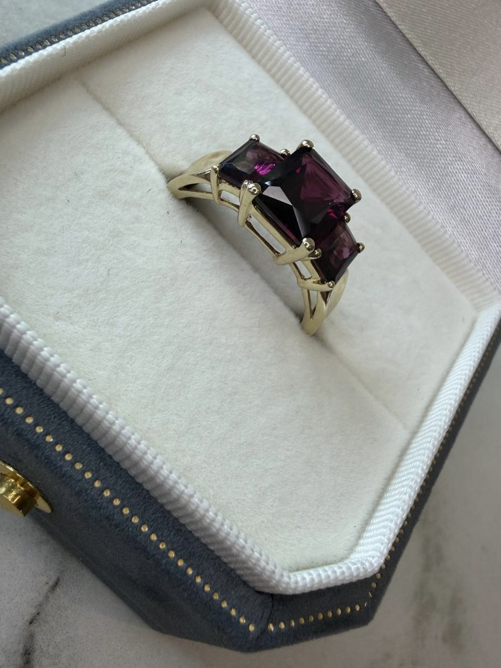 Prachtige vintage gouden ring met granaat. Door de strakke zetting heeft de ring een rustige uitstraling. Maar doe de mooie schittering van de geslepen edelstenen en de prachtige kleur is de ring ook een echte eye cather.