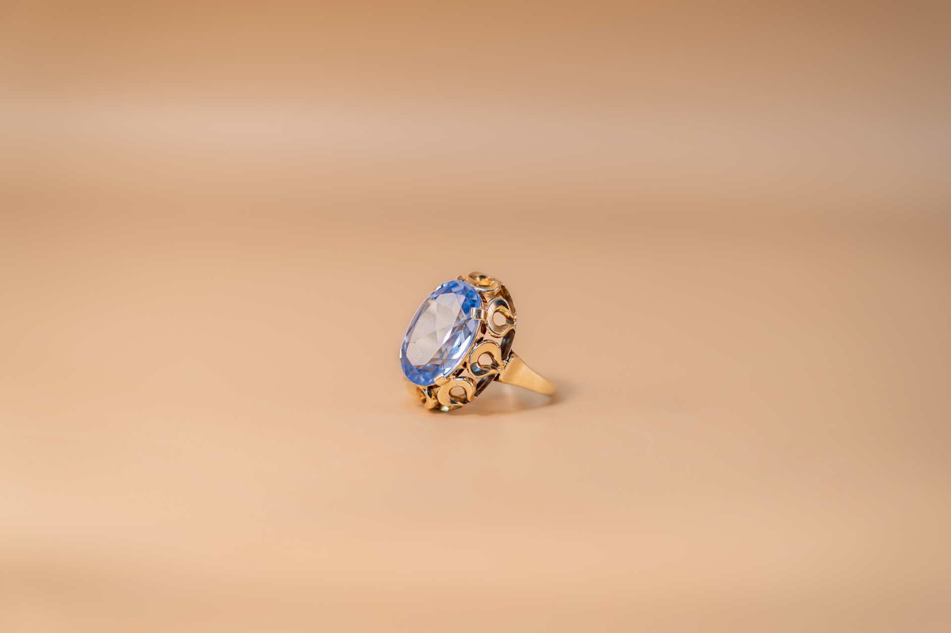 Deze prachtige vintage gouden ring is sierlijk en elegant. De ring is opvallend door zijn mooie helder blauwe kleur en de opvallende iets hogere zetting.