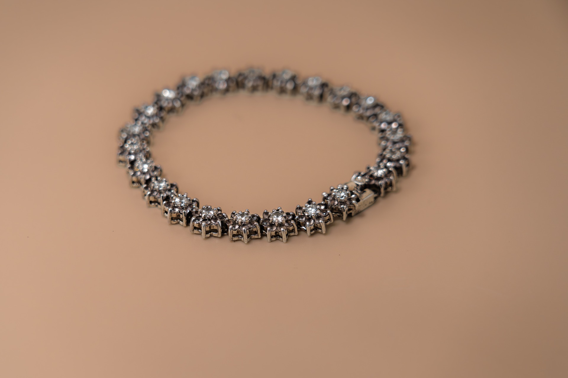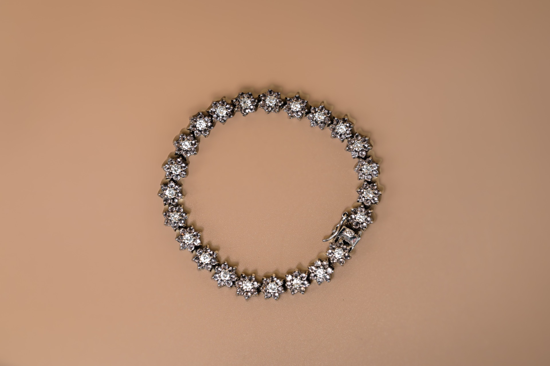 Prachtige vintage zilveren armband volzet met zirkonias. Hij schittert in het zonlicht en is uniek door zijn vorm.
