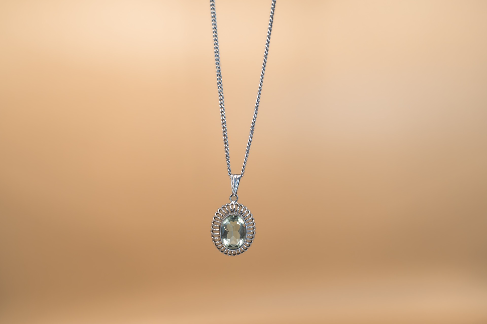 Prachtige zilveren ketting met een super mooie hanger met groene amethist. Door de zetting van de hanger wordt de ketting speels en chique tegelijk.